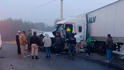 Fue en el kilómetro 51, en donde el conductor no guardó su distancia de seguridad y así chocó por alcance contra otro tráiler que circulaba adelante, un Kenworth color azul con doble remolque acoplado; tras el impacto el primer vehículo se salió del asfalto quedando descuadrado con la cabina destrozada y el chofer atrapado en su interior, esto frente a la gasolinera El Pueblito.