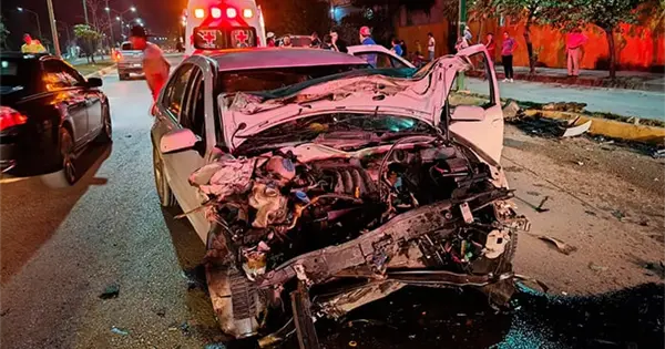 Fue este domingo por la noche, cuando el conductor de un Volkswagen Jetta blanco, al circular por el bulevar Lázaro Cárdenas con dirección de la glorieta Pedro Antonio Santos hacia la carretera Valles-Rioverde, presuntamente quiso dar vuelta a la izquierda para incorporarse a la avenida Vicente C. Salazar.