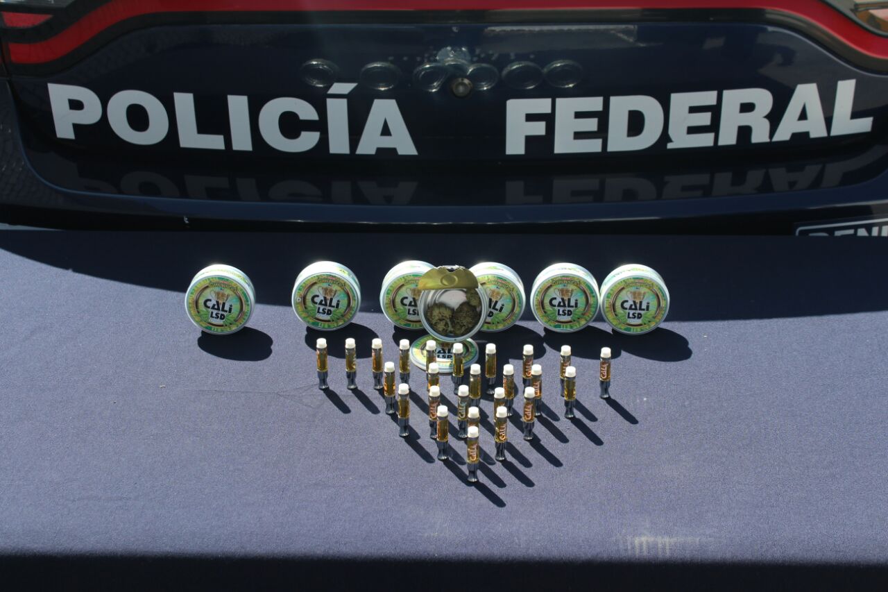 Dentro de la caja había 25 Pipas de Cristal con 274 gramos de aceite de marihuana y siete recipientes con 20 gramos de marihuana.