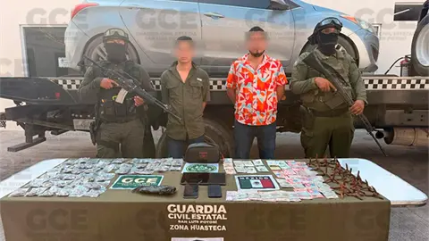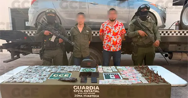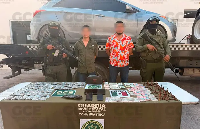 Los presuntos responden a los nombres de Francisco N. de 31 años de edad y Luis N. de 23 años de edad y quedaron a disposición de la autoridad competente junto con 23 artefactos metálicos conocidos como "poncha llantas", 50 bolsas plásticas en cuyo interior había hierba seca en color verde con las características propias de la marihuana, así como dos teléfonos celulares, la cantidad de $6,550.00 pesos (seis mil quinientos cincuenta pesos) y 01 vehículo marca Hyundai tipo Elantra en el que se trasladaban.