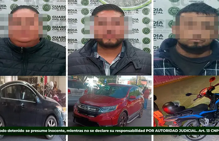 En el fraccionamiento Tangamanga, de la capital potosina, se detuvo a Miguel "N" de 33 años, asegurándose una camioneta Honda CRV, robada en la Ciudad de México y en la colonia Simón Díaz, se recuperó una motocicleta Itálika color negro con azul, deteniéndose a Luis"N" de 36 años.