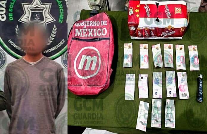 De inmediato se le dio a conocer que sería detenido por presunto robo a comercio, además de informarle los derechos que la ley le concede; en el lugar también se le aseguró el paquete de cervezas previamente señalados en el primer reporte, así como dinero en efectivo.