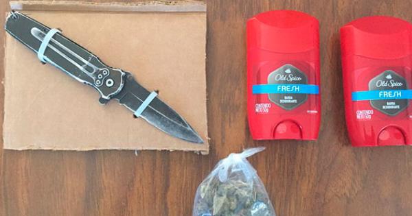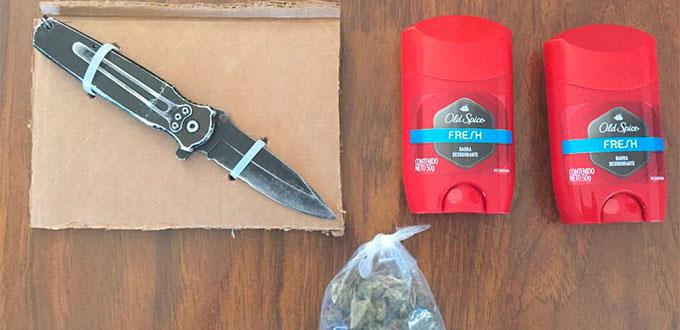 Al llevar a cabo una revisión al sujeto, se le encontró una navaja y una bolsa que en su interior contenía una hierba verde y seca con las características físicas de la mariguana, además del producto del robo, por lo que fue detenido y puesto a disposición de la Agencia del Ministerio Público.