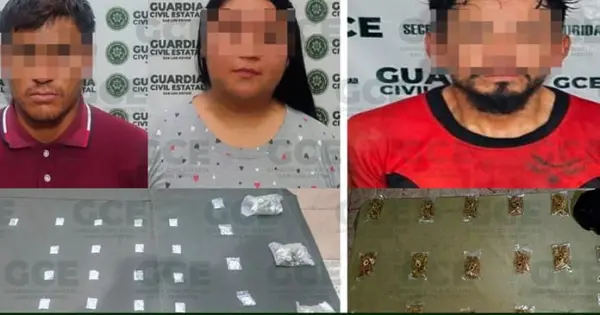 El primer hecho se registró en la colonia Díaz Ordaz, en Santa María del Río, donde elementos de la GCE detuvieron a Martín “N” de 26 años y a Marlene “N” de 19 años, tras asegurarles la cantidad de 20 dosis de “cristal”, ocho dosis de cocaína y tres de marihuana, que andaban vendiendo en la zona.