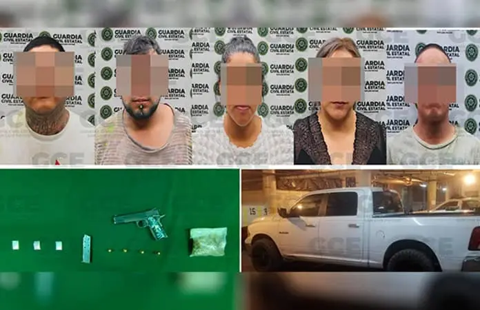 Los hechos tuvieron lugar en el fraccionamiento San Patricio, donde se detectó a los ocupantes de una camioneta línea Ram, de procedencia extranjera, a quienes se les aseguró un arma de fuego con cuatro cartuchos útiles, tres dosis de cocaína y una de marihuana.