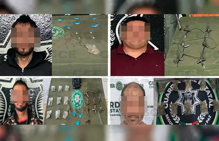 Una de las detenciones, ocurrió en la colonia La Concepción, en el municipio de Matehuala, donde Jonathan “N” de 24 años, fue asegurado con tres dosis de “cristal”, 11 bolsas de marihuana, dos dosis de “crack” y 10 artefactos metálicos conocidos como “poncha llantas”.