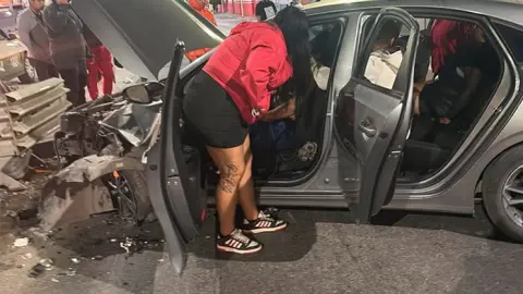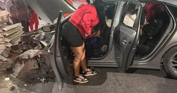 Por el fuerte golpe el carro quedó totalmente destrozado en la parte frontal y al sitio llegaron los paramédicos, quienes atendieron a los ocupantes del carro y dos de ellos, al parecer mujeres, resultaron con golpes y se evaluaba su traslado a un hospital a recibir atención médica.
