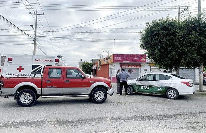 Un menor de edad y una persona adulta resultaron con golpes severos luego de impactar su camioneta contra un taxi en la colonia Rivas Guillén norte, de Soledad de Graciano Sánchez.