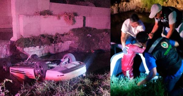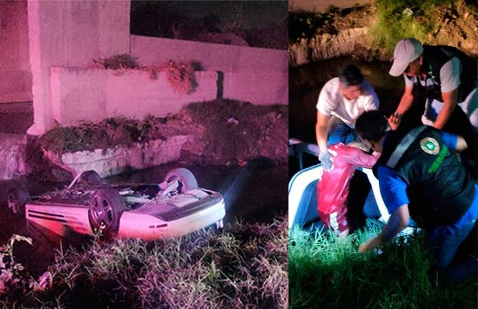 Los agentes viales atendieron un reporte en donde se indicaba que la volcadura de un automóvil en el río Santiago y el Anillo Periférico Oriente, en donde termina el pavimento e inicia el canalón de aguas negras.