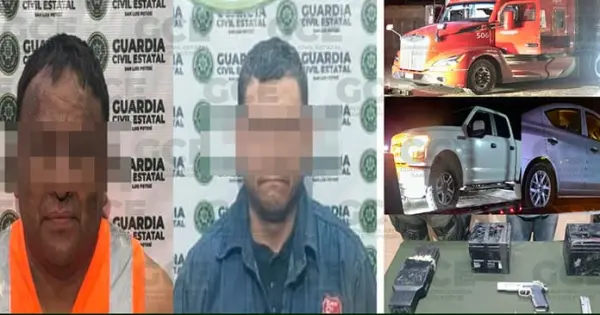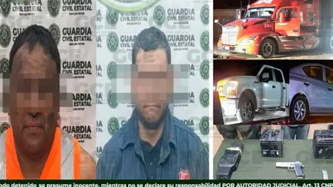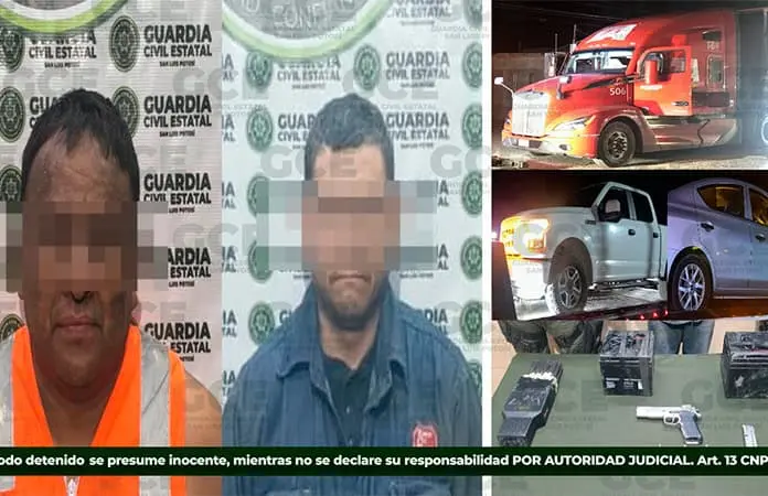 Los dos sujetos fueron asegurados con dos tráilers que cuentan con reporte de robo en la carretera federal 57 a México, a la altura de la comunidad El Cerrito, en el municipio de Santa María del Río.