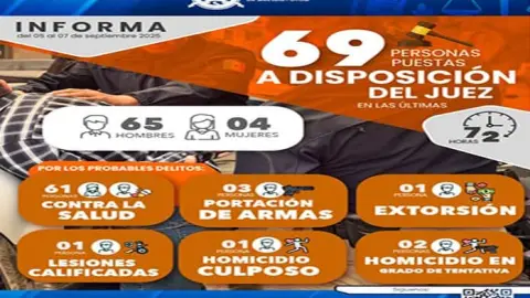 Este fin de semana, la Fiscalía General del Estado, en trabajo interinstitucional, llevó ante el Poder Judicial a 69 personas por su probable intervención en la comisión de diversos delitos ocurridos en la entidad.