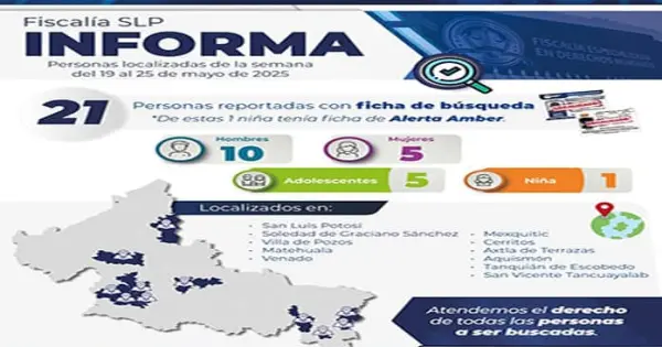 21 personas que eran buscadas en el territorio potosino, a través de fichas de búsqueda, fueron restablecidas a su núcleo familiar en la semana del 19 al 25 de mayo del 2025, informó la Fiscalía General del Estado de San Luis Potosí (FGESLP).
