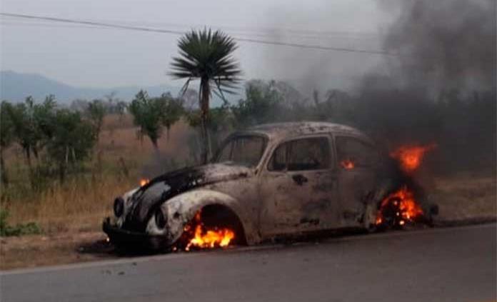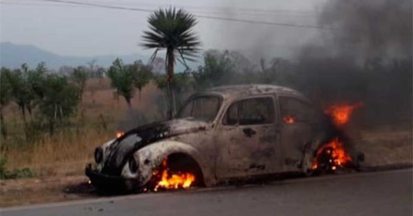 TANCANHUITZ.- Un vocho quedó en pérdida total luego de que comenzó a incendiarse cuando era manejado por la carretera Valles Tamazunchale; algunos automovilistas intentaron apagar las llamas y aunque llamaron al Sistema de Emergencias 911, las autoridades no llegaron.