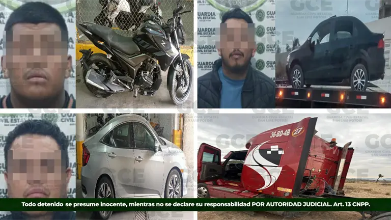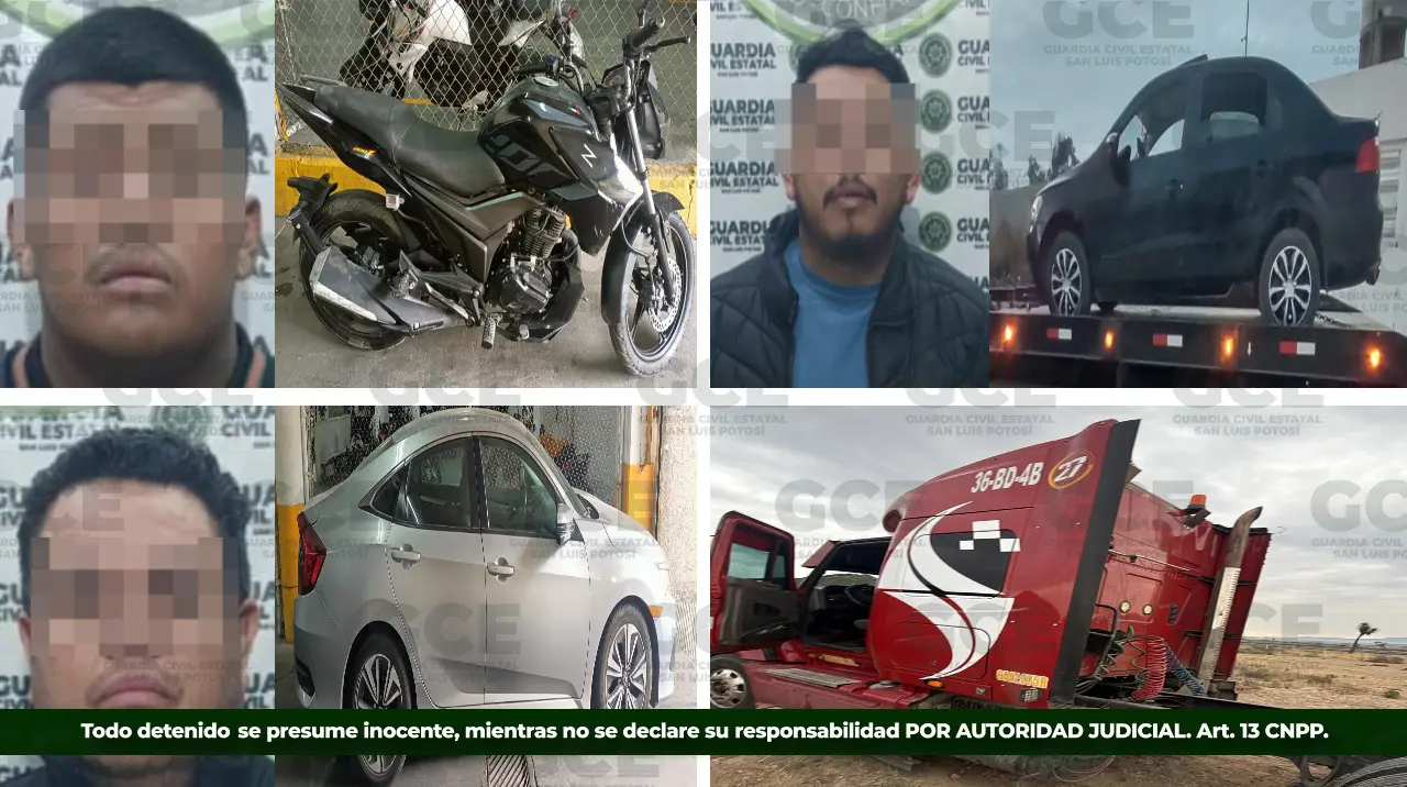 De manera adicional, en el municipio de Villa de Arriaga, la División Caminos de la Guardia Civil Estatal aseguró un tractocamión modelo 2014 que contaba con reporte de robo en esa misma demarcación.