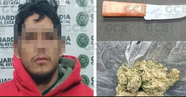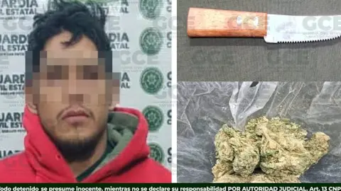 A través de los trabajos preventivos, desarrollados en la capital potosina, efectivos de la Guardia Civil Estatal detuvieron a un hombre que presuntamente andaba asaltando en calles del Barrio de San Sebastián, al que se le aseguro un cuchillo y una bolsa con marihuana que traía en su poder.