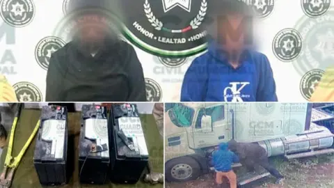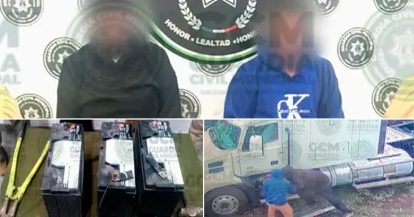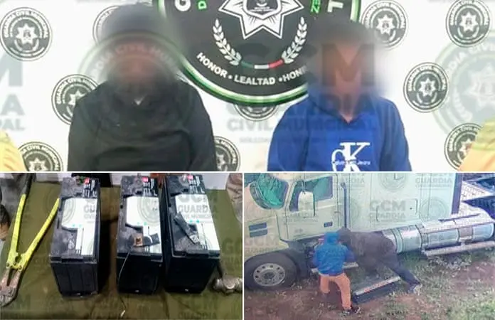 En atención a un reporte, oficiales de la Policía Vial Municipal de Soledad detuvieron a dos hombres que robaban las baterías de los tráliers en una empresa de transportes ubicada en la carretera a Matehuala.