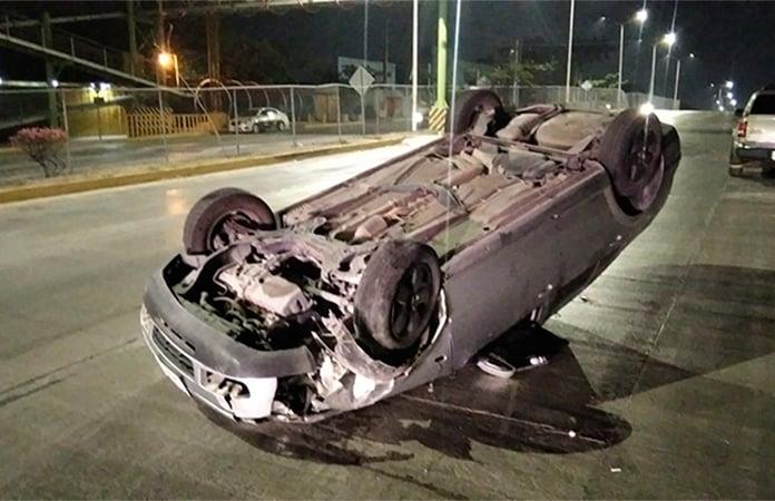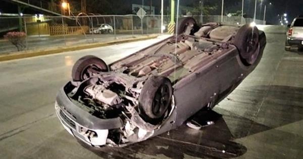 El sedán trepó a la banqueta, chocó contra un barrote de concreto y después volcó, quedando llantas arriba.