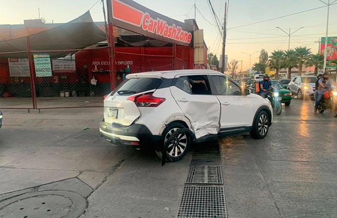 Un accidente vial en donde participaron tres vehículos, dejó como saldo dos personas lesionadas y daños materiales de consideración, en hechos ocurridos en el cruce de la avenida Damián Carmona y la calle Juan del Jarro.