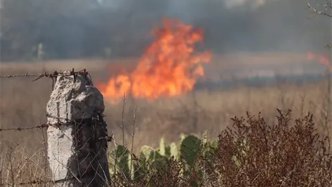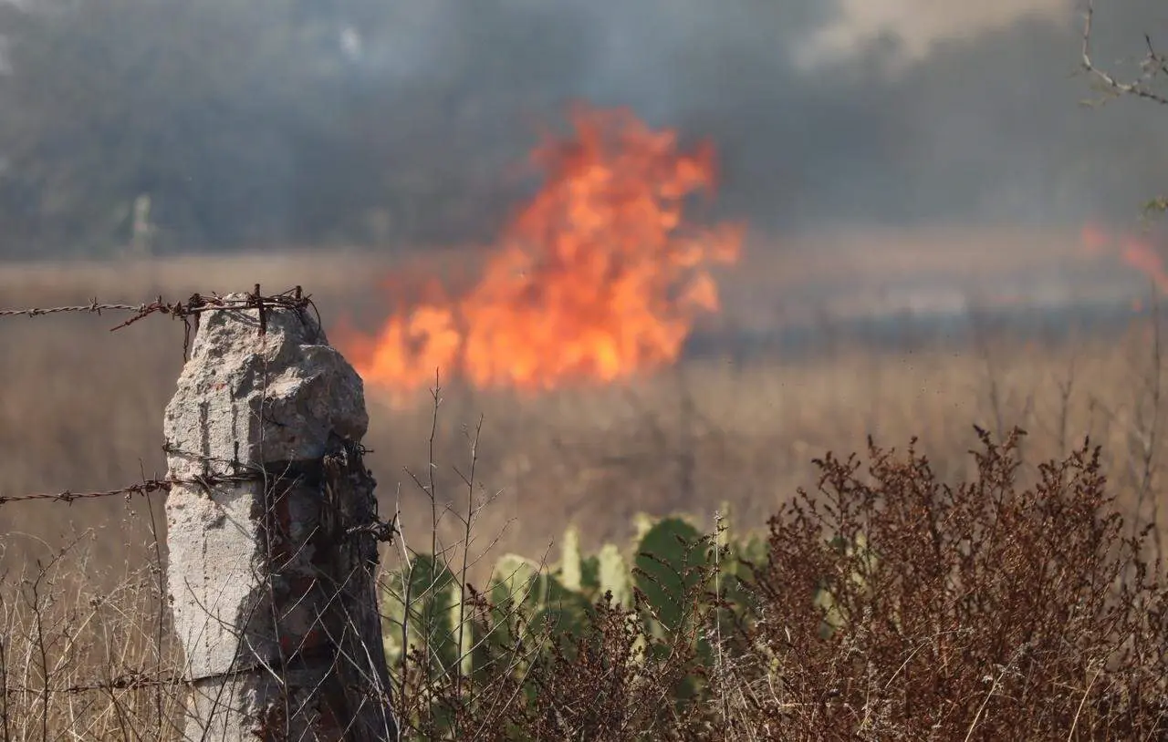 Derivado posiblemente del "efecto lupa", esta tarde se reporta un incendio en un predio limítrofe a la carretera 57, localizado en la localidad de Enrique Estrada, en el municipio de Soledad de Graciano Sánchez.