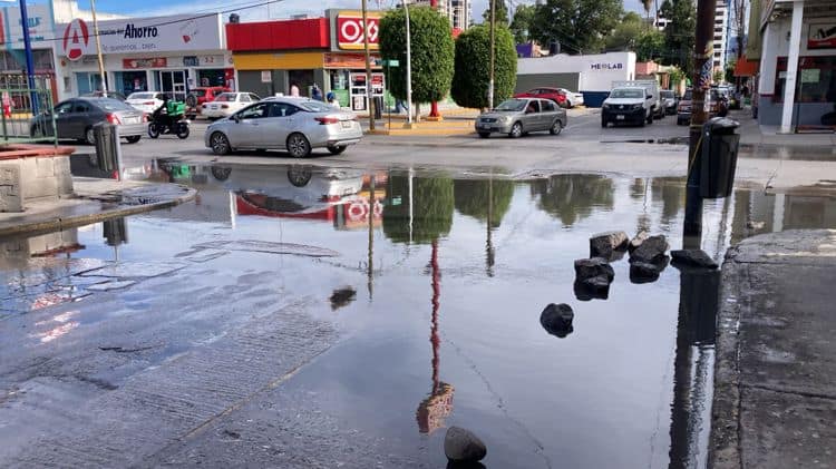 Una fuga de aguas negras provocada por una obra de Interapas mantiene en jaque a vecinos y comerciantes en la avenida Nicolás Zapata esquina con Benigno Arriaga, en la capital potosina.