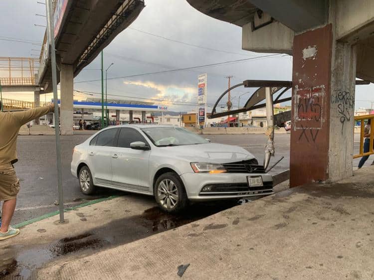 ¡Choque en Hogares Ferrocarrileros! Jetta termina incrustado en parador de autobuses