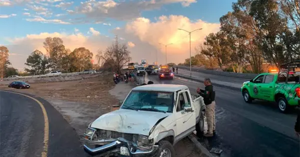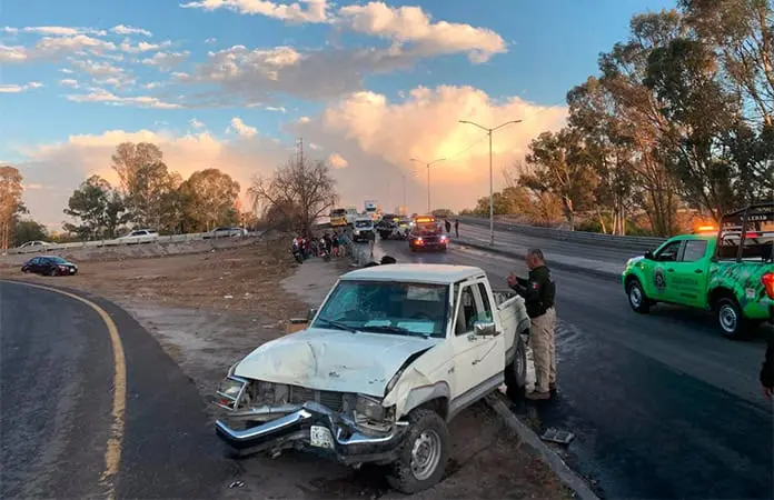 Los cinco vehículos circulaban por el Periférico con dirección a la carretera a Zacatecas y al llegar la cima del puente de la carretera a Matehuala, no guardaron su distancia de seguridad y así chocaron por alcance, además al frenar intempestivamente se resbalaron ante el piso mojado.