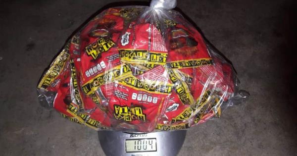 A las 4:30 horas, al realizar una revisión aleatoria en el centro de distribución regional del aeropuerto, con apoyo de un binomio canófilo, se localizó una caja de cartón procedente de Querétaro con destino a Nuevo Laredo, que guardaba 2 bolsas de plástico con diferentes tipos de dulces, una de ellas con la leyenda de “Rockaleta”, la cual contenía 35 envolturas de paletas, cada una con un polvo blanco granulado con las características propias a la metanfetamina (cristal), sumando 1 kilogramo de referida droga.