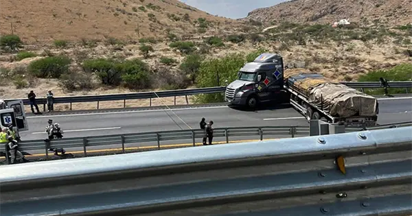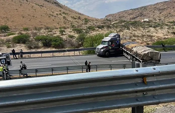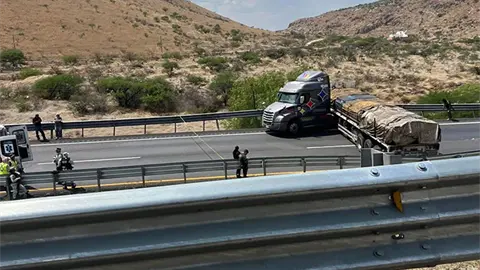 El tráiler que manejaba es un Freightliner con tractocamión color gris, el cual traía un remolque tipo plataforma cargada con barras de acero.