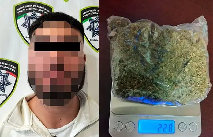 Al entrevistarse con el señalado, se le realizó una revisión preventiva de seguridad encontrándole al interior de una mochila que portaba, un envoltorio que contenía hierba seca verde con las características similares a la marihuana con un peso de 22.8 gramos.