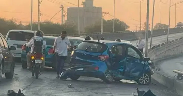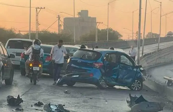 Fue en la parte ascendente hacia el puente de las vías a Tampico, en donde los tres vehículos chocaron por alcance y el que se llevó la peor parte fue el carro azul que acabó destrozado casi por completo y una mujer que ahí viajaba resultó con golpes considerables.