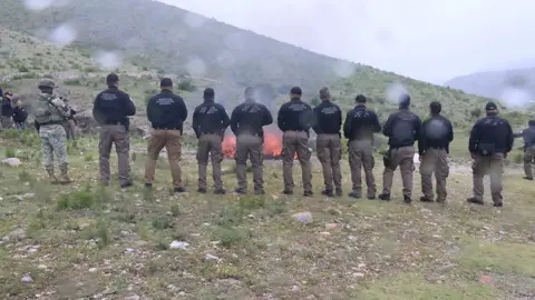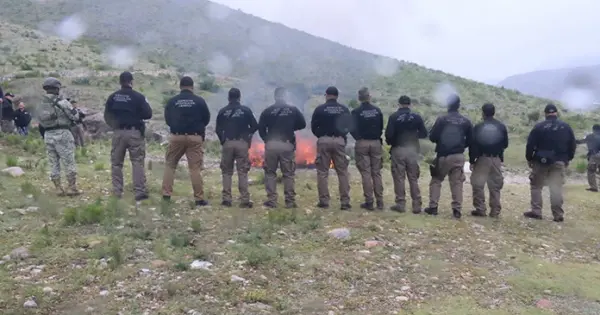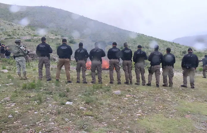 También se destruyeron 67 piezas de objetos del delito consistentes en uniformes tácticos, mochilas, tenis, cascos, báscula digital gramera, vapeadores, entre otros.