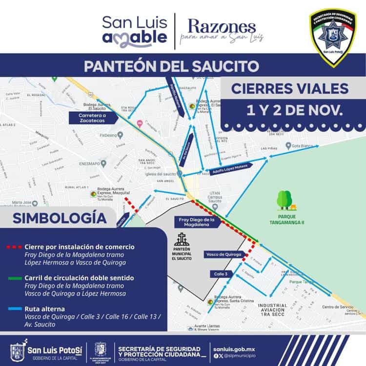 La dependencia informó que el Panteón del Saucito permanecerá abierto las 24 horas durante ambos días, debido a que es el más concurrido por la ciudadanía. Para facilitar el acceso y la instalación de comercio semifijo autorizado, se realizarán cierres viales a partir de las 23:00 horas del viernes 31 de octubre.