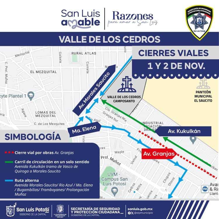 Con motivo de la celebración del Día de Muertos, la Secretaría de Seguridad y Protección Ciudadana (SSPC) del Ayuntamiento de San Luis Potosí anunció un operativo especial de vigilancia y control vial en los principales panteones de la ciudad, con el objetivo de garantizar la seguridad, el orden y la accesibilidad de los visitantes durante los días 1 y 2 de noviembre.