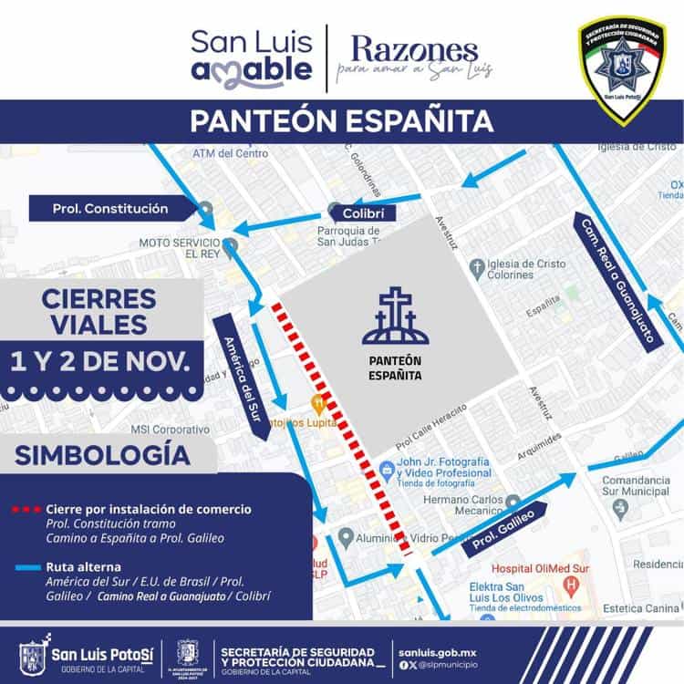 En el caso del panteón Españita, también se contemplan cierres en la vialidad de Prolongación Constitución, en el tramo que va de Camino Antiguo a Españita hasta la calle Galileo.