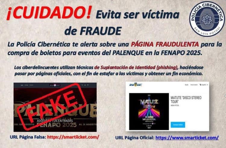 La Secretaría de Seguridad y Protección Ciudadana (SSPC) del Estado advirtió sobre prácticas de suplantación de identidad en redes sociales para el robo de datos o 'phishing', con la supuesta venta de boletos para shows de la Feria Nacional Potosina (Fenapo).