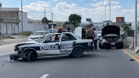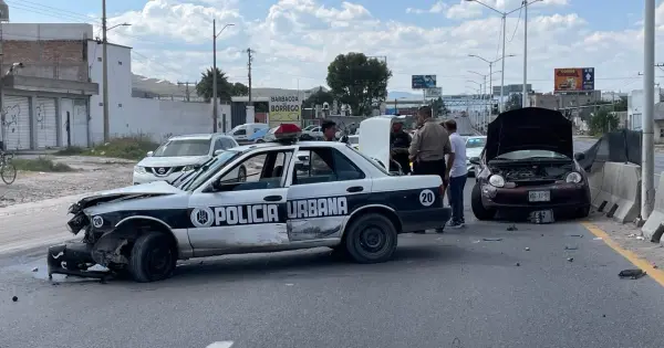 Patrulla choca contra muro y auto en el Circuito Potosí