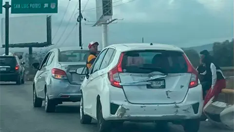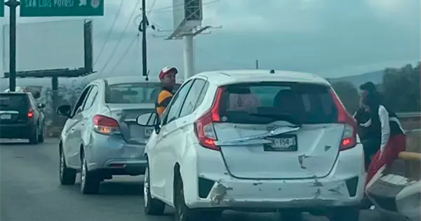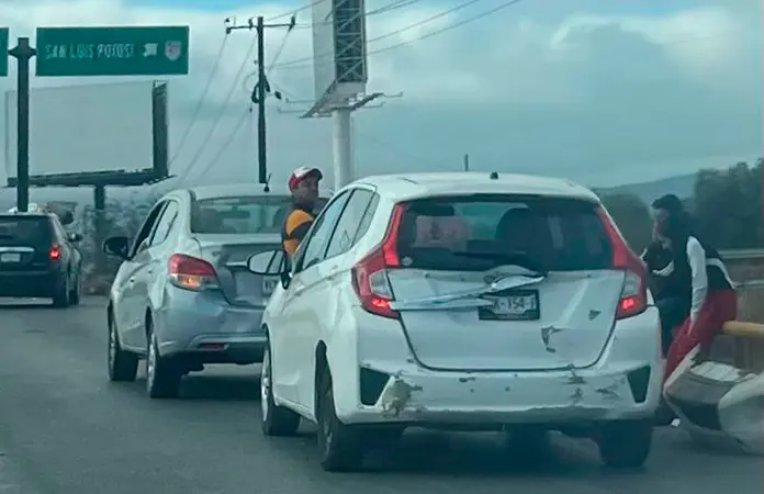 Al tomar el puente de la avenida Industrias, el conductor no guardó su distancia de seguridad próximo a la ramal de salida a la carretera a México y así chicó por alcance contra un automóvil Chevrolet Spark de color blanco que también se desplazaba por ahí en esos momentos.