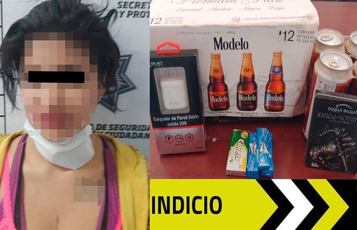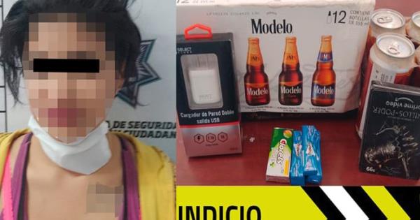 La parte afectada, luego de narrar lo sucedido solicitó proceder legalmente contra Gabriela “N” quien fue encontrada en posesión de una caja de cerveza de 12 piezas, un cargador para teléfono, seis paquetes de chicles y 10 tarjetas de Amazon Prime y cuatro latas de cerveza.