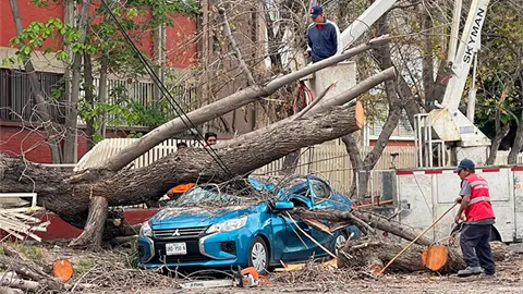 Ante los fuertes vientos registrados, un enorme árbol ubicado dentro del Centro Escolar Morelos en la calle Uresti de la zona centro, cedió y aplastó a un automóvil que se encontraba estacionado junto a la banqueta al cual dejó totalmente destrozado.