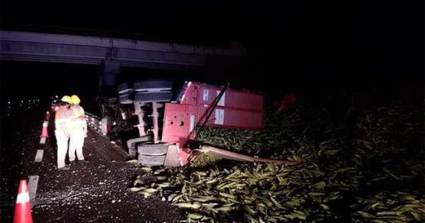 CIUDAD VALLES.- Sólo daños materiales, dejó como saldo la volcadura de un tráiler que transportaba elotes, y que se dirigía al municipio de Rioverde.