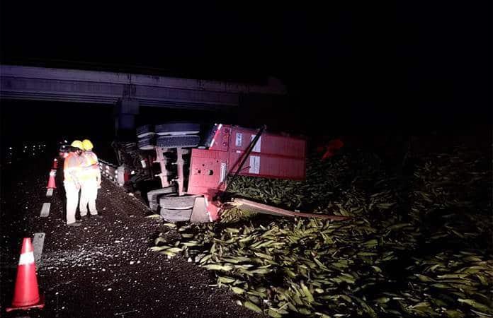Por falla mecánica, vuelca tráiler con elotes
