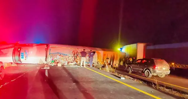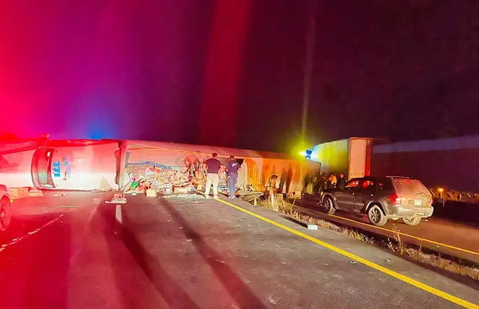 El chofer del tráiler, un Kenworth blanco cargado con productos no perecederos, había salido de Tampico, Tamaulipas, con destino a la ciudad de San Luis Potosí. Sin embargo, durante el trayecto perdió el control del volante y la unidad terminó volcada sobre uno de sus costados, bloqueando ambos sentidos de la circulación.
