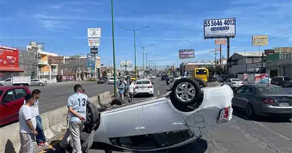 Un automóvil que circulaba a exceso de velocidad provocó aparatoso accidente en la carretera a Rioverde en donde chocó contra un poste metálico, luego se volcó y también le pegó a otro carro que por ahí circulaba.