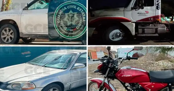 De igual manera, los uniformados estatales aseguraron un vehículo Honda Civic, modelo 1998, color gris, que tenía reporte de robo sin violencia el día 13 en la colonia San Francisco, en Soledad, recuperado en la misma colonia del robo.