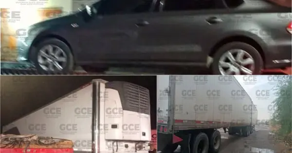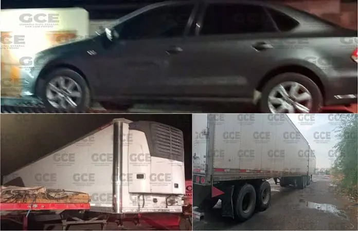 La División Caminos de la GCE aseguraron en la comunidad La Noria de San José, dos remolques tipo caja seca, modelos 2014 y 2017, acoplados por un Dolly, mismos que tenían reporte de robo en la localidad de Calderón, en el municipio de Villa de Reyes.