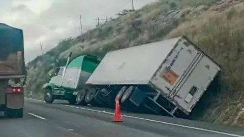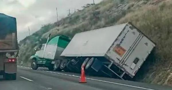 El otro percance ocurrió en el kilómetro 145 de la misma carretera, en donde otro tráiler con remolque tipo caja, derrapó hacia su derecha y así quedó recargado sobre el cerro, causándose algunos daños pero en este caso el conductor salió ileso.