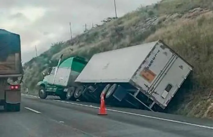 En la carretera a México dos tráiler sufrieron aparatosos accidentes, uno se volcó resultando lesionado el conductor mientras que el otro prácticamente se “recostó” sobre el cerro, esto a la altura de la comunidad El Cerrito perteneciente a Santa María del Río.