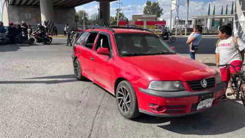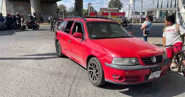 Fue la tarde de este jueves cuando se suscitó el accidente entre una motocicleta color negro y una automóvil Volkswagen Pointer de color rojo, luego de que al parecer los conductores no se cedieron al paso en la parte inferior del puente del Periférico y la carretera a Zacatecas.