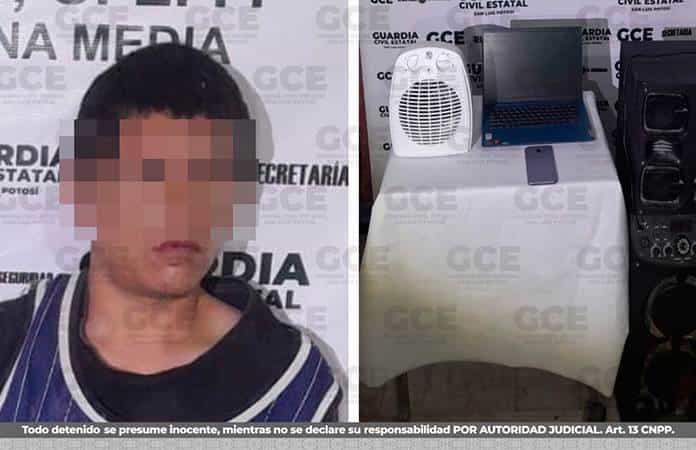 A la llegada de los efectivos de la Guardia Civil Estatal, la posible parte afectada pidió el aseguramiento de Geovani “N” de 24 años, a quien se le aseguró un teléfono celular, una computadora portátil, un ventilador portátil y una bocina.