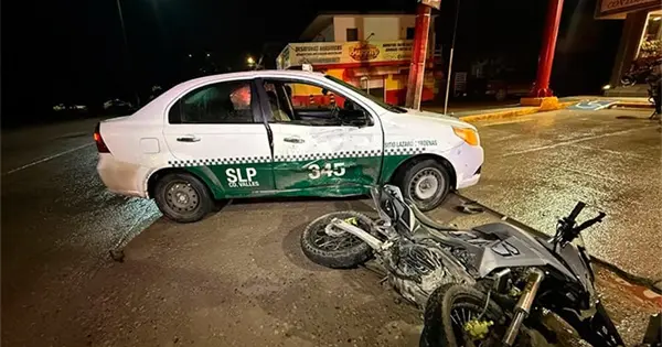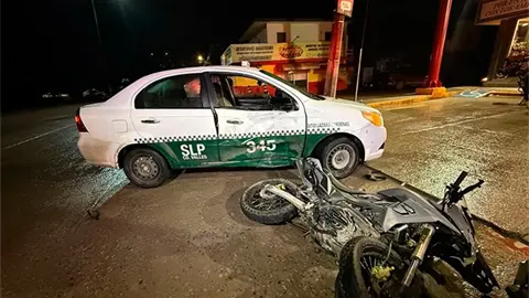 CIUDAD VALLES.- Un taxista que pretendía ingresar a la colonia Obrera, no tuvo precaución al realizar una maniobra y chocó contra una motocicleta en la que viajaba una pareja.